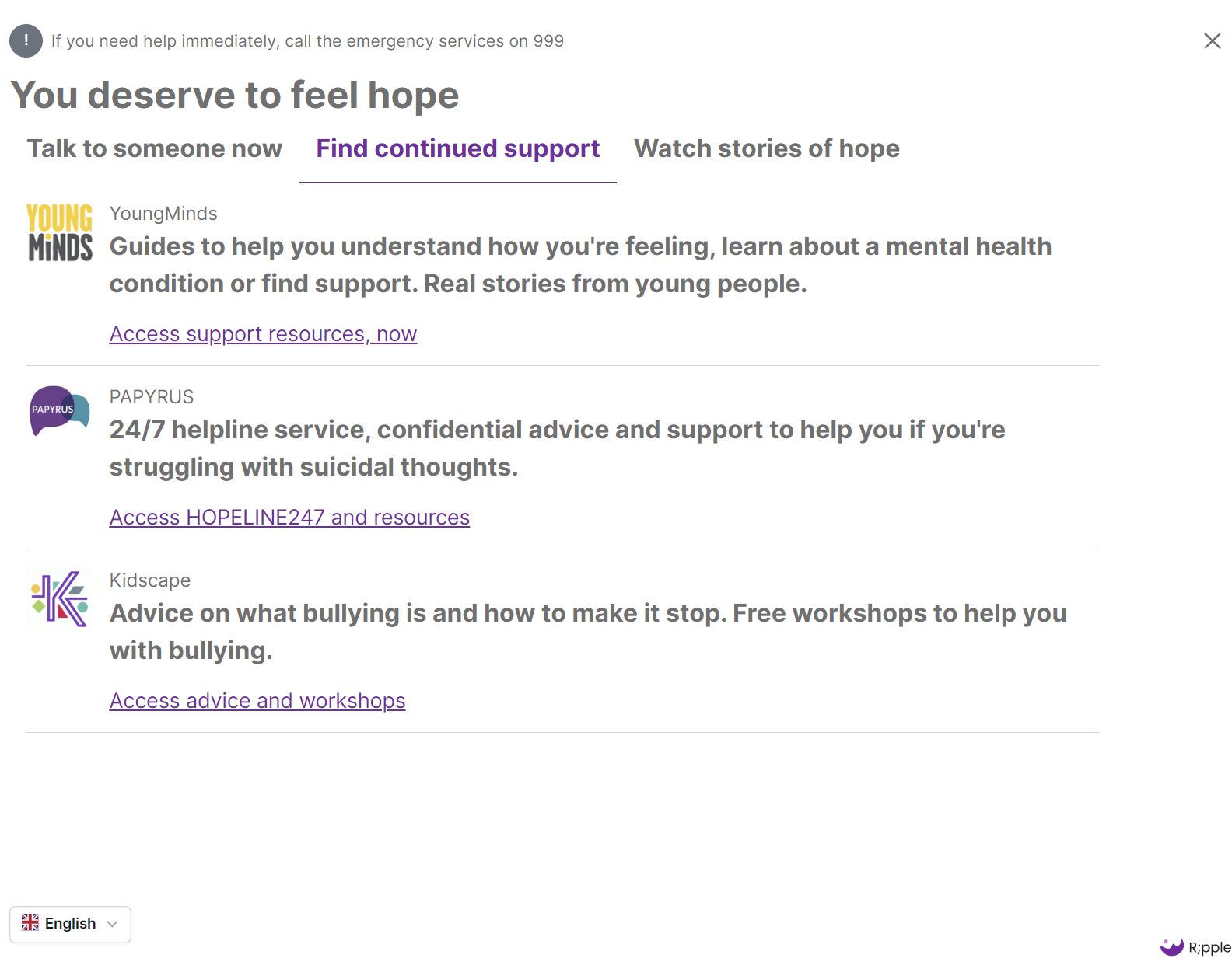 When a student searches online for ways to self-harm or take their own life, the Ripple tool intervenes with a calmly presented pop-up screen that first helps them pause and reflect, then signposts them to 24/7 helplines and mental health resources.